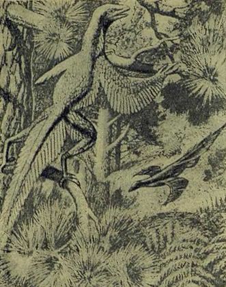 Что же касается происхождения птиц, то тут случилось большая удача. В горах Баварии на известковом сланце найдены были не только кости жившей в юрский период птицы, но даже отчетливый отпечаток ее распластанных крыльев и хвоста со всеми перьями. Птицу эту назвали археоптериксом, древней птицей.