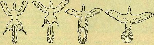 Птеродактили, которых мы находим окаменелыми в мезозойских пластах, бывают различных размеров. Одни из них величиной с воробья, а другие больше самых больших нынешних птиц. У некоторых длинные тонкие хвосты, другие бесхвосты.
