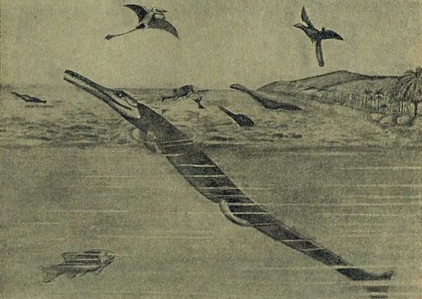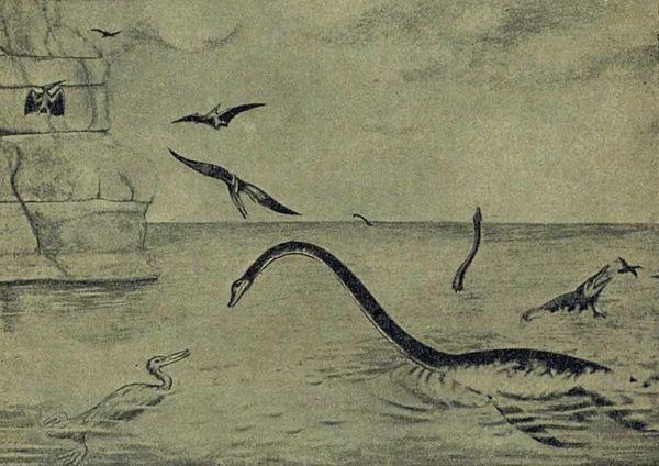 Море мелового периода. Справа — плезиозавр, за ним вдали — ихтиозавр охотящийся на птиц, слева — гесперорнис; в воздухе парят птеродактили.