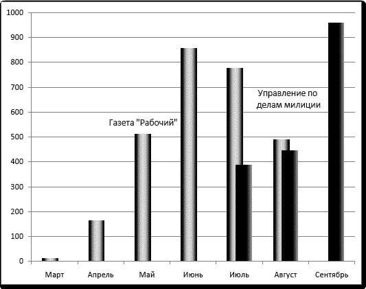 Диаграмма № 2. Число крестьянских волнений, по данным газеты «Рабочий» и Управления по делам милиции[121]