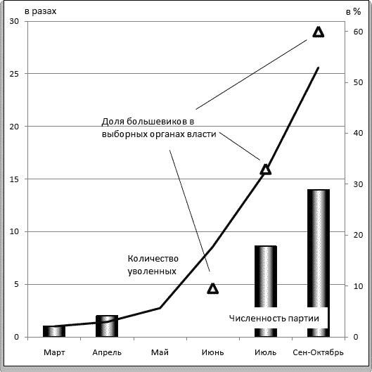Диаграмма № 4. Рост количества: уволенных рабочих[154] и численности партии большевиков[155] (по отношению к марту), в разах; доля большевиков в центральных выборных органах власти в 1917 г., в %[156]