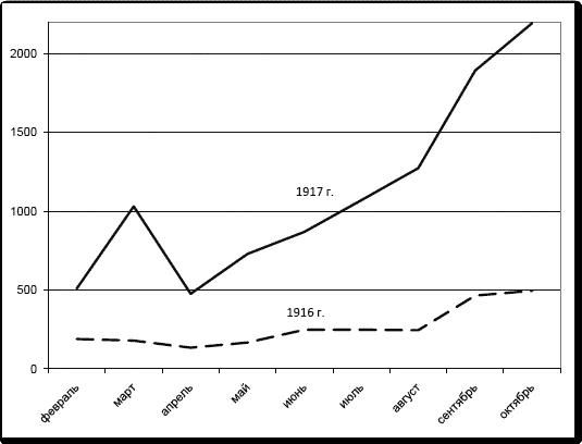 В октябре 1916 г. шеф Петроградского жандармского департамента в своем отчете указывал: «Экономическое положение массы, несмотря на огромное увеличение заработной платы, более чем ужасно. В то время как заработная плата у массы поднялась всего на 50 %, и лишь у некоторых категорий (слесаря, токаря, монтеры) на 100–200 %, цены на все продукты возросли на 100–500 %»[138].