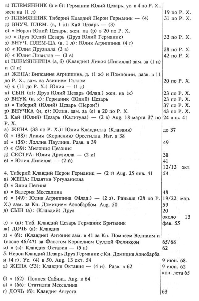 (Сокращения: Ус. — усыновлен. Сопр. — соправитель. Aug. — Augustus, Augusta. Изг. — изгнан. Caes. — Caesar. Д — дочь. Жен. — женат. Разв. — разведен. Fil. Aug. — Filius Augusti. Зам. — замужем. Ж. — жена. С. — сын.)