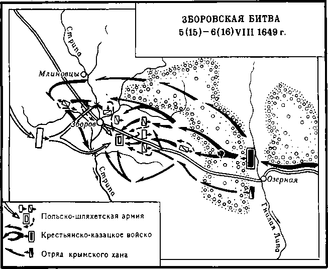 Возобновление военных действий. Зборовская битва. В апреле 1649 г. правительство шляхетской Польши объявило посполитое рушение (всеобщую мобилизацию шляхты), а в начале мая ее войска под командованием А. Фирлея и С. Ланцкоронского перешли р. Горынь и расположились в укрепленных лагерях на Волыни и Подолии. Вскоре к ним присоединились шляхетские отряды Н. Остророга, И. Вишневецкого и других магнатов, а также несколько тысяч иноземных наемников. Крупная группировка войск, возглавляемых литовским гетманом Я. Радзивиллом, сосредоточилась в Белоруссии. Поход на Украину возглавил король Ян II Казимир.