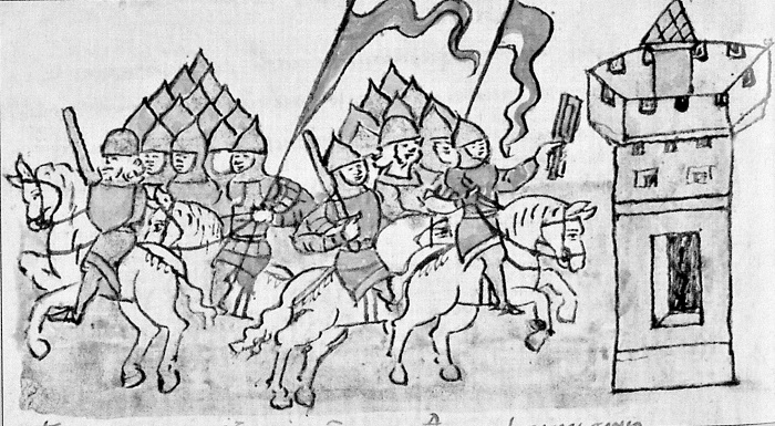 Возвращение дружины великого князя Всеволода Юрьевича из похода на Глеба Ростиславича Рязанского; поход войск Глеба Ростиславича в Рязань. Миниатюра из Радзивилловской летописи. XVI в.
