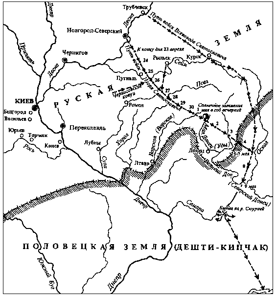 Схема маршрута похода Игоря Святославича на половцев в 1185 г. (по Б.А. Рыбакову)