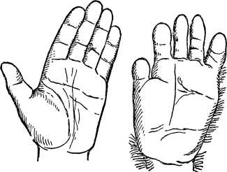 Рис. 19. Слева — рука человека, справа — рука обезьяны (вид со стороны ладони).