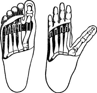 Рис. 20. Слева — стопа нижней конечности человека, справа — стопа нижней конечности обезьяны. Большой палец ноги обезьяны обладает самостоятельным движением и способен схватывать, удерживать предметы.