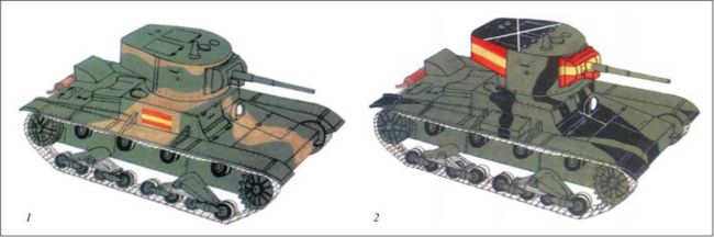 Раскраска этого Т-26 вооруженных сил националистов несколько необычна, однако это не вымысел художника; отсутствие эмблемы Иностранного легиона при наличии полного набора опознавательных знаков указывает на то, что машина использовалась в 1937 г.