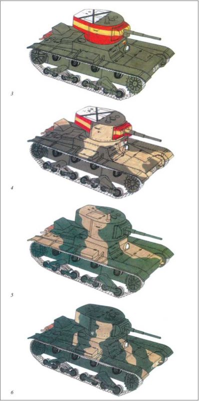 К 1937 г. система распознавания в какой-то степени стандартизировалась и стала выглядеть несколько иначе — камуфляж представлял собой черные полосы, нанесенные поверх основного зеленого фона (рис. 2). Раскраска танка Т-26, изображенная на рис. 3, несколько необычна, однако это не вымысел художника; обращает внимание отсутствие эмблемы Иностранного легиона при наличии полного набора опознавательных знаков, что прямо указывает на то, что машина использовалась в 1937 г. Наконец, на рис. 4 мы видим Т-26 наиболее типичной раскраски, использовавшейся после 1936 г. Правда, на одном из парадов 1938 г. Т-26, кроме номеров и креста св. Андрея на крыше башни, других знаков не имели. Заметим, что песочный камуфляж на машинах Т-26 был позаимствован националистами у республиканцев, поскольку они просто накрашивали свои эмблемы на трофейные машины.