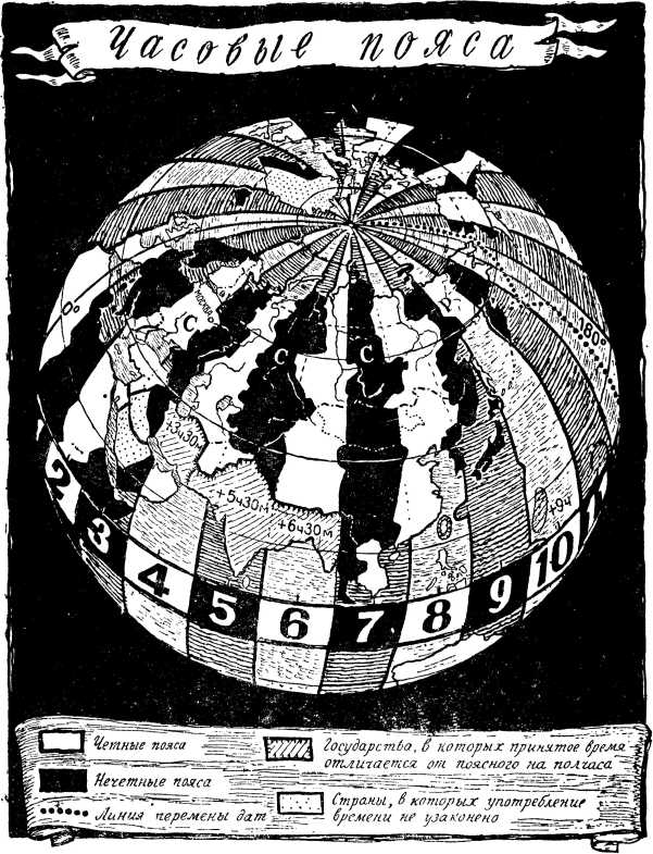 Остальные границы часовых поясов проведены по берегам больших рек, по границам союзных республик, так чтобы они по возможности не задевали населенных пунктов. Только в малонаселенных пространствах тундры, пустынь и сибирской тайги границы часовых поясов проложены прямыми линиями, точно по меридианам.