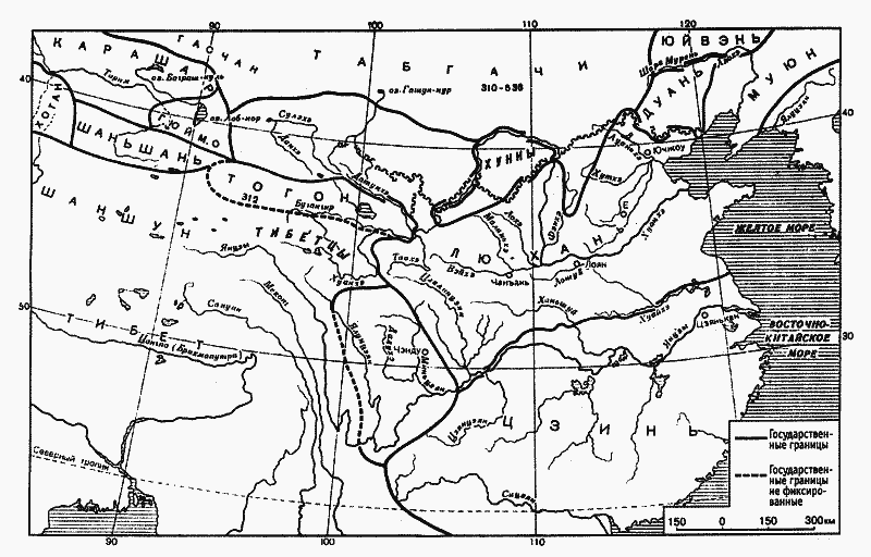 В то время как Китай раздирали ссоры принцев и гражданские войны, на северной границе сложилась следующая ситуация. На востоке, в Юго-Западной Маньчжурии, возникла крепкая держава южносяньбийских Муюнов с явно выраженными агрессивными намерениями против слабеющего Китая. Рядом вся Степь была объединена табгачскими ханами, еще более воинственными и столь же ретиво стремящимися на юг. Успехам табгачей мешало лишь разделение их орды между тремя ханами– Лугуанем, Ито и Илу, и связанное с этим распыление сил[663]. Это обстоятельство на время вырвало из рук табгачей инициативу, чем и воспользовались хунны.
