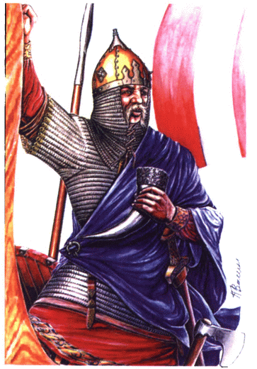 Воин в золоченом шлеме. По материалам X в. Акварель-реконструкция П. Васина