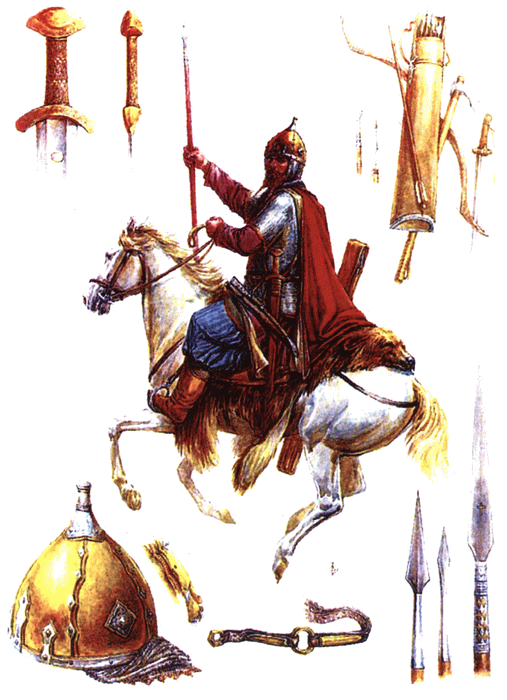 Воин в золоченом шлеме и образцы вооружения, найденные в «Черной могиле». Акварель художника О. Федорова