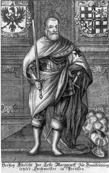 Герцог Альбрехт Ⅰ (1490–1568), маркграф Бранденбургский. Последний гохмейстер Немецкого ордена; в 1852 г. стал первым герцогом Пруссии.