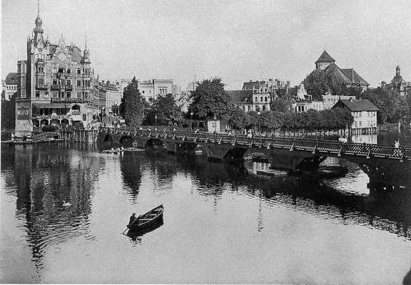 Кёнигсберг. Вид на пруд Шлосстайх с пешеходным мостом.