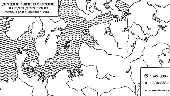 Что касается роли скандинавов на этом начальном этапе торговли, то из 16 кладов конца VIII – первой трети IX в. только три обнаружены на Готланде и один в Упланде, на территории материковой Швеции. Два ранних готландских клада (783 и 812 гг.) очень малы. В одном из них содержалось 8, в другом 11 монет. Третий датируется 824 г., а клад из Упланда – 825 г. Остальные 12 западноевропейских кладов ничего общего со Скандинавией не имеют: пять из них найдены в Померании и датируются 802, 803, 816, 816 и 824 гг.; три – в Восточной Пруссии и датируются 811, 814 и 818 гг.; три в Западной Пруссии – 808, 813 и 816 гг.; один клад 810 г. обнаружен в Мекленбурге.