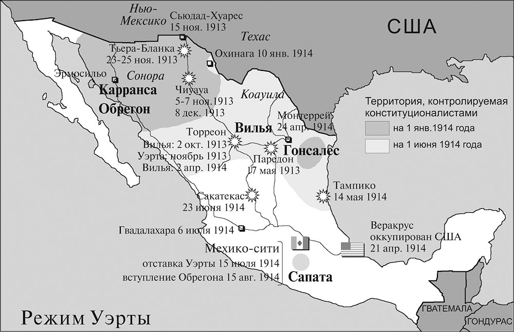 Карранса же не имел под своим контролем единой территории. Сам он после отплытия американцев обосновался в Веракрусе.[389] Дьегес с частями Северо-Западной армии был на другом, тихоокеанском берегу в штате Халиско. Хесус Карранса находился в Оахаке, и между ним и братом стояли войска Сапаты. Наконец, на северо-востоке Вильяреаль держался в Тампико и Коауиле и мог поддерживать коммуникации с Каррансой только по морю.