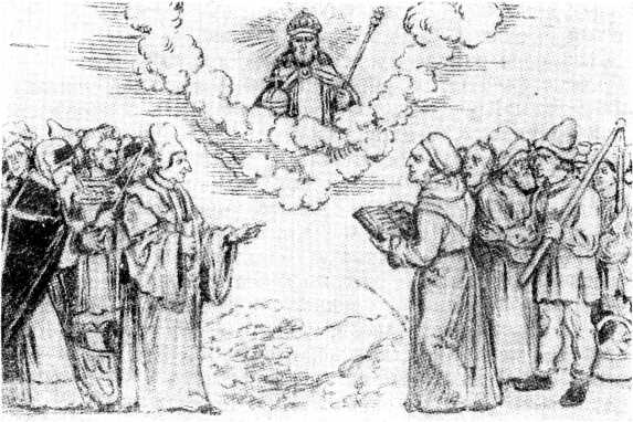 Протестантская листовка XVI в. под названием «Ложные и истинные апостолы Христа». Слева — католики («ложные апостолы»), справа — протестанты («истинные»). Между ними идет жестокий спор о том, как толковать евангелие. В царском облачении Христос с небес бесстрастно взирает на эту сцену.