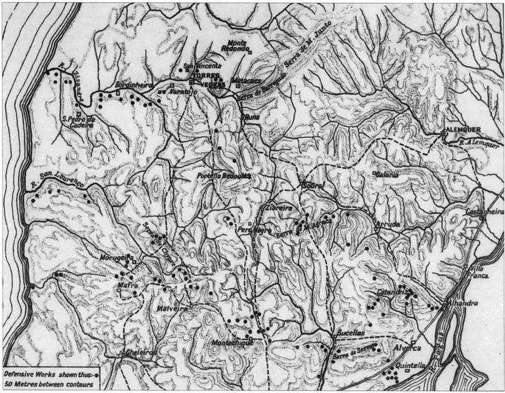 Эти оборонительные позиции протянулись от океана до широкого залива в устье реки Тежу. Для строительства был выбран отличный район в южной части провинции Эстремадура, отмеченный в свое время еще французским полковником-инженером Венсаном, когда в Лиссабоне стояла армия Жюно, а также военным топографом майором Баррейрушем и бригадным генералом Невеш Коштой.
