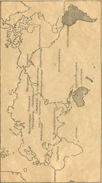 Центры происхождения и расселения главнейших отрядов млекопитающих (по Осборну). Карта эта была составлена проф. Г. Осборном на основании его теоретических выводов о вероятном нахождении центров образования различных отрядов млекопитающих в 1900 г. В 1901 г. английскими исследователями в той области Африки, которая обозначена на карте словом «хоботные», действительно были открыты ископаемые предки этих животных. Последняя американская экспедиция Эндрьюса обнаружила в Центральной Азии ископаемые остатки восьми главных групп млекопитающих из общего числа тринадцати, как и было предсказано Осборном.