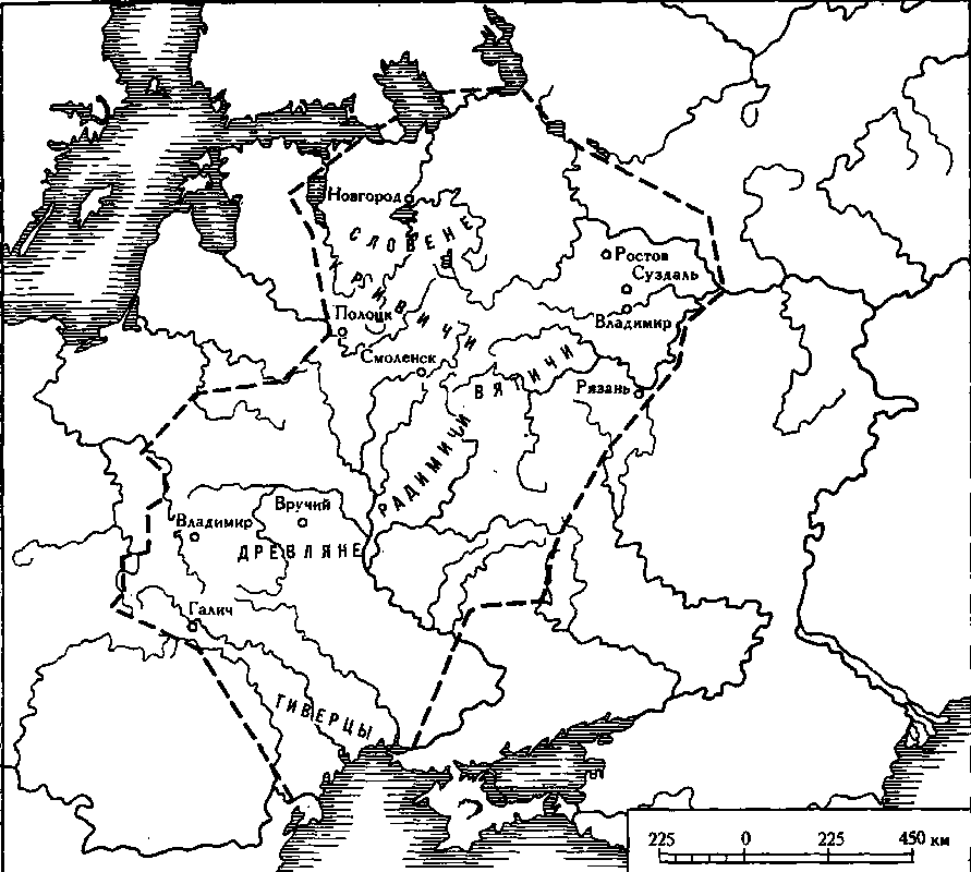 Область древнерусской народности IX–XIII вв. (родоначальницы позднейших братских народностей — русской, украинской и белорусской) может быть восстановлена по целому ряду разнородных источников как письменных, так и археологических, хотя летописцы XII в. и не оставили нам систематического описания ее границ. Во-первых, область Русской земли в широком смысле слова может быть получена как сумма племенных территорий всех восточнославянских племен, исходя из тезиса летописца, что «словеньскый язык и рускый — одно есть…» Во-вторых, некоторое представление о границах Русской земли XI–XII вв. может дать карта русских городов, упоминаемых в летописях по тому пли иному случаю[27]. Это не систематический перечень русских городов, и поэтому возможны пропуски, но в общих чертах карта летописных городов дает нам весь театр действий феодальной Руси.