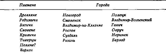 В состав собственно Руси, Руси в узком (первоначальном?) смысле, не входили, по этим неполным данным, земли следующих племен и города: