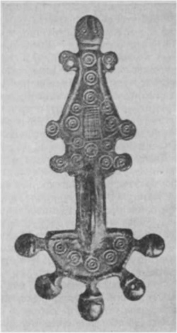 Одним из ранних типов V–VI вв. являются пальчатые фибулы типа Мартыновского клада (р. Рось) с характерным рельефным спиральным узором на щитках. Географически этот тип фибул охватывает Поросье, встречается в Северской земле и в Муромской. Несколько более поздними (VI, может быть, VII в.) являются упрощенные пальчатые фибулы, у которых рельефный спиральный узор заменен концентрическим циркульным орнаментом. Эти фибулы можно подразделить на два основных типа: простые пальчатые и птицеголовые, у которых верхний щиток обрамлен кружевом из шести (четырех) птичьих голов и одной звериной. Географически оба типа не разделяются — оба они очень часты в случайных находках в Русской земле от бассейна Роси и далее на восток до Донца и Дона. Хронологически оба типа едва ли различны; оба они относятся к VI–VII вв. Кроме описанных выше нескольких типов фибул, характерных для всей лесостепной Русской земли в V–VII вв., следует упомянуть о существовании еще двух типов фибул, встреченных только в западной приднепровской части Русской земли; это — антропоморфно-зооморфные со сложной композицией и более простые двуглавые зооморфные фибулы IV–VII вв., которые нам придется рассмотреть подробнее ниже. Область пальчатых фибул является, кроме того, и областью спиральных височных колец, не встречаемых нигде за пределами Русской земли.
