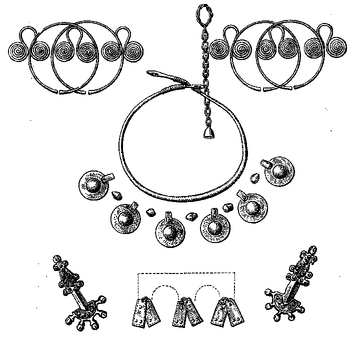 Почти обязательное для всех кладов сочетание оружия, мужских вещей и женских украшений снова заставляет нас вернуться к вопросу о погребениях — не являются ли все эти «клады» остатками погребений и именно парных погребений воина с женой?