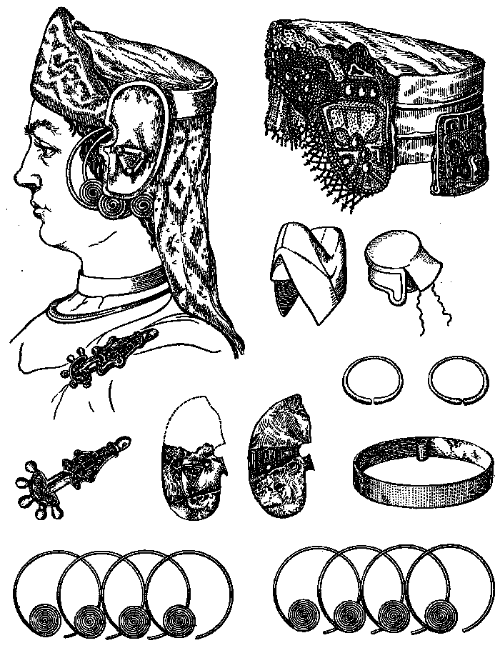 3. Характерные особенности костюма, выясняемые по инвентарям кладов, находят прочные параллели в русском, украинском и белорусском этнографическом материале (кокошники с «ушами», вышитые на груди мужские рубахи, вправленные в шаровары).