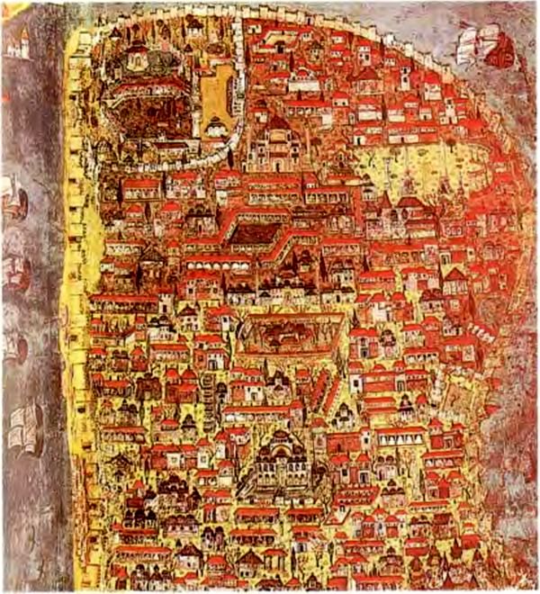 Осада Константинополя. Фрагмент росписи Смоленского собора Новодевичьего монастыря в Москве, XVI в.