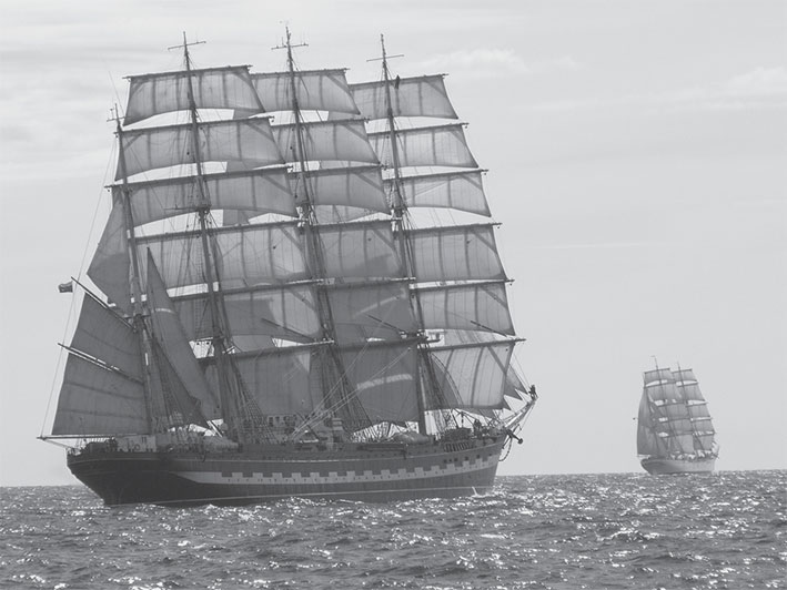 Правда, у всех были металлические корпуса и рангоут, а бегучий такелаж изготавливался из стальных тросов. Поэтому капитаны – а Лайеш нанимал самых опытных, – полагаясь на крепость судов, в свежую погоду ставили на 60-метровых мачтах сразу много парусов и нередко обгоняли пароходы, делавшие в те годы от силы 10–12 узлов.