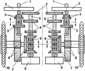 1 — носок коленчатого вала, 2 — главный фрикцион, 3 — скользящие шестерни ведущего вала, 4 — шестерни передаточного вола, 5 — ведущий вал, 6 — подвижная втулка конической передачи, 7 — коническая шестерня бортового вала, 8 — бортовой редуктор, 9 — тормоз, 10 — ведущее колесо.