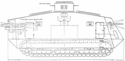 Проект танка A7V с «длинным» бронекорпусом, двумя симметрично установленными местами водителей и установками для 77 мм «штурмовой» и 20-мм пушек.