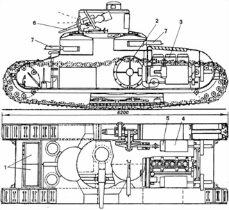 1 — посадочные люки, 2 — ведущее колесо, 3 — двигатель, 4 — коробка передач, 5 — тормоз, 6 — 57-мм пушка, 7–7,92-мм пулемет MG.08.