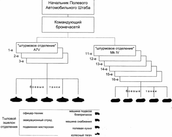 Танковые «штурмовые отделения» подчинялись командующему бронечастями, штаб которого располагался в Шарлеруа (Бельгия), где размещался 20-й Баварский армейский автопарк. В его мастерских готовились к бою и проходили ремонт как A7V, так и трофейные Mk IV. Командующий бронечастями подчинялся Начальнику полевого автомобильного штаба при ставке Главного командования.