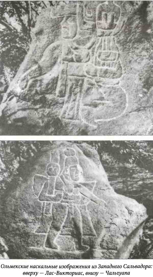 Много споров вызывала среди специалистов гигантская гранитная стела высотой около 4,5 м и весом без малого 50 т. Ее украшает какая-то сложная и непонятная сцена. Друг против друга стоят два человека в вычурных головных уборах. Персонаж, изображенный справа, имеет ярко выраженный европеоидный тип: с длинным орлиным носом и узкой, как бы приклеенной козлиной бородкой. Многие археологи в шутку называют его «дядей Сэмом», поскольку он действительно очень напоминает эту традиционную сатирическую фигуру. Лицо другого персонажа — оппонента «дяди Сэма» — было намеренно повреждено еще в древности, хотя по некоторым уцелевшим деталям можно догадаться, что перед нами опять-таки изображен человек-ягуар. Необычность всего облика «дяди Сэма» зачастую давала пищу для самых смелых гипотез и суждений. Однажды его объявили представителем белой расы и на этом основании приписали некоторым правителям ольмеков чисто европейское (вернее, средиземноморское) происхождение. Ну как здесь не вспомнить о «голове эфиопа» из старых работ Мельгара и о мифических плаваниях африканцев в Америку! На мой взгляд, для таких выводов пока нет никаких оснований. Ольмеки, бесспорно, были американскими индейцами, а отнюдь не неграми или белокурыми суперменами.