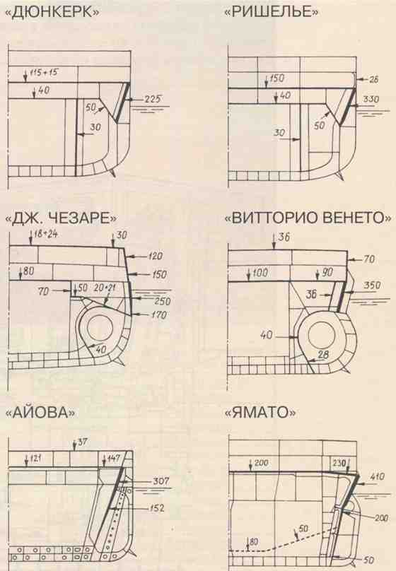 Эти «маленькие хитрости» (наклон пояса и разнесенная броня) использовались в большинстве проектов последних линкоров. Так, наклонные плиты имели следующие типы (в скобках — угол наклона в градусах): английский «Нельсон» (22), французские «Дюнкерк» (14), «Ришелье» (15), американские «Вашингтон» (17), «Саут Дакота» и «Айова» (по 19), итальянские «Литторио» (12), японские «Ямато» (20). Немецкие кораблестроители показали себя явными консерваторами: на «Шарнхорсте» и «Бисмарке» они установили обычный наружный пояс без наклона, повторивший форму борта. К такому же решению пришли в своих последних линкорах англичане. Подобное ретроградство имело свой резон. Не говоря уже о чисто конструкторских и производственных проблемах, новомодные схемы с внутренней броней оставляли незащищенным обшивку, подверженную действию мелких снарядов и даже осколков. В результате защита не пропускала снаряды в машины и погреба, но позволяла кораблю набрать немало воды во внешние отсеки. Это отрицательно сказывалось на его остойчивости и ходовых качествах и требовало ремонта в доке после каждого боевого столкновения.