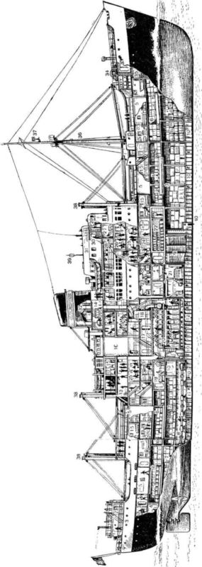 Устройство двухвинтового грузо-пассажирского теплохода. 1 — камбуз команды; 2 — лазарет; 3 — жилые помещения команды; 4 — отсек рулевой машины; 5 — шахты грузовых трюмов; 6 — междупалубные помещения для груза (твиндеки); 8 — коридор гребного вала; 9 — топливные цистерны; 10 — цистерны пресной воды; 11 — балластные цистерны; 12 — цистерны смазочного масла; 13 — закрытая прогулочная палуба; 14 — аварийные дизель-динамо; 15 — каюты пассажиров; 16 — машинная шахта; 17 — мастерская; 18 — вспомогательный котел; 19 — прачечная, 20 — машинное отделение; 21 — отделение вспомогательных двигателей; 22 — ледник; 23 — камбуз для пассажиров; 24 — вестибюль; 25 — ресторан; 26, 27 — салоны; 28 — каюта капитана; 29 — рулевая рубка; 30 — штурманская рубка; 31 — верхний ходовой мостик; 32 — дымовая труба (в нее выведены выхлопные трубы двигателей и вентиляционные шахты); 33 — шкиперская кладовая; 34 — брашпиль; 35 — цепной ящик; 36 — мачта с грузовыми стрелами; 37 — антенны радиопеленгатора; 38 — грузовые колонки со стрелами; 39 — антенна радиолокатора; 40 — выгородка лага и эхолота.