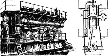 Двигатель современного теплохода чаще всего делают шестицилиндровым и двухтактным. 1 — рабочий цилиндр; 2 — водяное охлаждение; 3 — форсунка; 4 — сжатый воздух для продувания цилиндров; 5 — поршень; 6 — выхлопная труба; 7 — топливный насос; 8 — шатун; 9 — коленчатый вал.