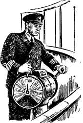 А почему же движется стрелка и кто дает такие распоряжения? Оказывается, на мостике (и в ходовой рубке) имеется прибор точно с таким же циферблатом. Он установлен на невысокой тумбочке, а сбоку приделана ручка. Вот капитан или его помощник поворачивает ручку, пока стрелка не станет, например, против надписи «Малый вперед». В машине зазвонит звонок. Все посмотрят на циферблат и увидят, что и здесь стрелка показывает «Малый вперед». И сразу исполняют команду. Но, прежде чем исполнить, поставят ручку своего прибора против стрелки. Тогда на мостике прибор зазвонит и стрелка на нем покажет, что механик понял команду.