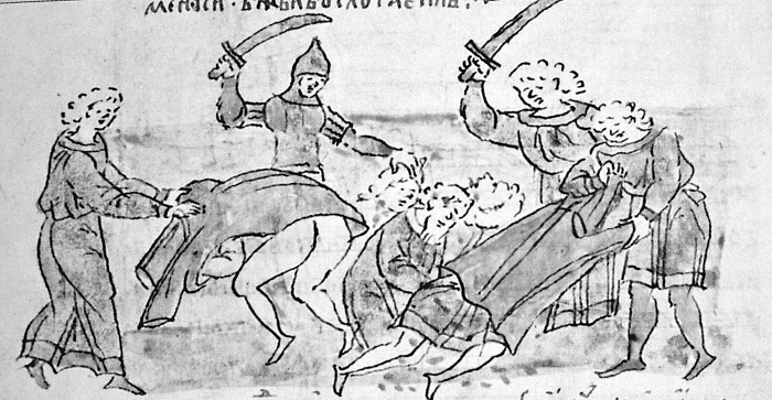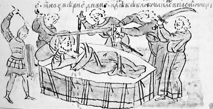 Что же до отрубленной левой руки Андрея, то художник в данном случае руководствовался не сокровенными знаниями об истинном положении вещей, которых у него не было и не могло быть, а требованиями иконографической традиции, которые говорили ему, что убитого (или убиваемого) князя следует изображать лежащим головой на запад, то есть налево, в соответствии с христианским обычаем погребения. Эта художественная условность господствует не только на всех миниатюрах, посвященных расправе над Андреем, но также и на некоторых других рисунках Радзивилловской летописи с аналогичным сюжетом. Диктуемое традицией положение тела князя и определило то, на какую из его рук должен прийтись удар Петра. Так что на самом деле художник сознательно погрешал против летописного текста не для того, чтобы исправить его, а для решения своих, чисто художественных задач. Но художественная вольность неожиданно оказалась ближе к истине, чем исторические свидетельства.