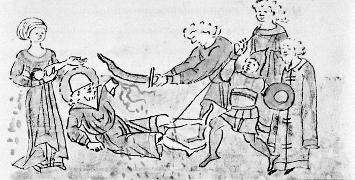 Когда в поздних сказаниях о свержении правителя и смене власти появляется роковая женщина, «злая жена», то это обычно служит верным признаком того, что историческое предание вступило в стадию мифологизации. Поэтому такой поворот сюжета об убийстве Андрея должен был бы насторожить историков, настроив их на критическое восприятие известия Тверской летописи. Вместо этого многие из них охотно ввели супругу Андрея в круг участников заговора, хотя древнейшие летописные списки ничего не сообщают о супружеской жизни князя, в том числе и о его женитьбе на «болгарыне». «Царицей доказательств» в данном случае признана одна из миниатюр Радзивилловской летописи, иллюстрирующих расправу заговорщиков над Андреем, а именно та, которая изображает последнюю сцену убийства князя. На ней запечатлен момент, когда Петр отсекает Боголюбскому руку. Неожиданно здесь то, что рука эта – левая, и держит ее, уже полностью отделенную от тела, женская фигура, стоящая в головах поверженного князя. При этом рисунок противоречит тексту Радзивилловской летописи, где в полном согласии с «Повестью об убиении» говорится об отсечении у Андрея десницы и ни словом не упоминается его жена. После того как исследование останков Андрея развеяло все сомнения относительно его отрубленной руки, эта миниатюра была немедленно возведена в ранг первостепенного источника, подтверждающего версию Тверской летописи об участии Андреевой княгини в заговоре против мужа. Ход мыслей исследователей был примерно таков: если древнерусский художник смело поправил летописный текст в отношении руки Боголюбского, значит, он был знаком с другой исторической традицией, сохранившей правильные представления об обстоятельствах смерти Андрея, и традиция эта возлагала ответственность за убийство князя на его жену, почему художник и поместил ее изображение на своем рисунке.