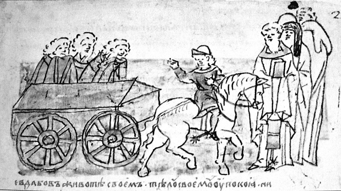 Перевоз тела великого князя Андрея Юрьевича Боголюбского из Боголюбова во Владимир духовенством и другими жителями города. Миниатюра из Радзивилловской летописи. XVI в.
