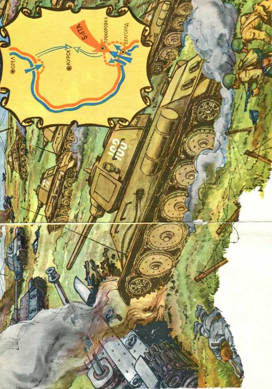 Головные тридцатьчетверки так стремительно сблизились с врагом, что «тигры» успели сделать всего несколько выстрелов. Боевые порядки перемешались. Теперь «тигры» не имеют преимущества: «Т-34» бьют в упор и пробивают их 100-мм броню. Но и наши танки уже не могут использовать свою скорость, чтобы увернуться от снаряда «тигра» — 50—100 метров снаряд пролетает в мгновение. Теперь все решает боевое мастерство наводчиков, хладнокровие командиров, виртуозность механиков-водителей. Среди лязга гусениц, дыма, взрывов экипажи подбитых танков выскакивают из люков и бросаются в рукопашную схватку…