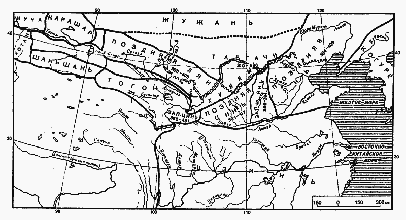 Агония дружины Фу Дэна затянулась до 394 г., но он пережил своего врага Яо Чана на один год. Яо Син, унаследовавший власть в Младшей Цинь, сначала разбил войска Фу Дэна, который был при этом убит, а потом его сына, на чем и закончилось самостоятельное существование народа ди. Остатки этого героического племени смешались с победителями-тибетцами; впоследствии они вошли в состав средневековых тангутов, или дансянов[804]. Но нас сейчас больше занимает положение и состояние победившего государства – Младшей Цинь. Ведь оно тоже, включив в себя большое количество местных жителей, стало тибето-тангуто-китайской химерой и, как таковое, оказалось лицом к лицу с сяньбийцами, окружавшими его с востока, запада и севера, где прикрывавшие Шэньси ордосские хунны испытали на себе силу табгачского оружия.