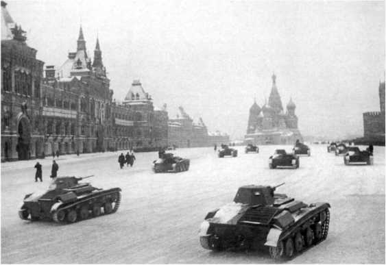 По Красной площади едут танки Т-60. 7 ноября 1941 г. Танки Т-60, сделанные на основе автомобильных агрегатов, стали одним из символов «тотальной войны» советской экономики
