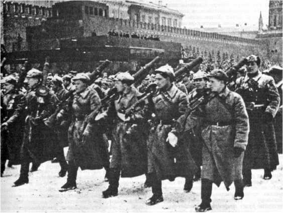 Парад на Красной площади 7 ноября 1941 г. Бойцы, идущие в первом ряду, вооружены английскими 7,71-мм ручными пулеметами Льюис времен Первой мировой войны