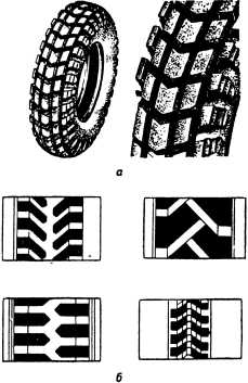 Рис. 161. Покрышка и типы рисунков на протекторе покрышки: а — покрышка с протектором повышенной проходимости; б — типы протекторного рисунка шин повышенной проходимости.