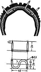 Этот шип делается из стальной проволоки, изогнутой в виде латинской буквы S, концы которой отгибаются перпендикулярно плоскости изгиба и запиливаются на острие. Такие шипы в количестве от 30 до 40 штук прокалываются сквозь покрышку таким образом, что острие, т. е. самый шип, выходит наружу на 5–8 мм.